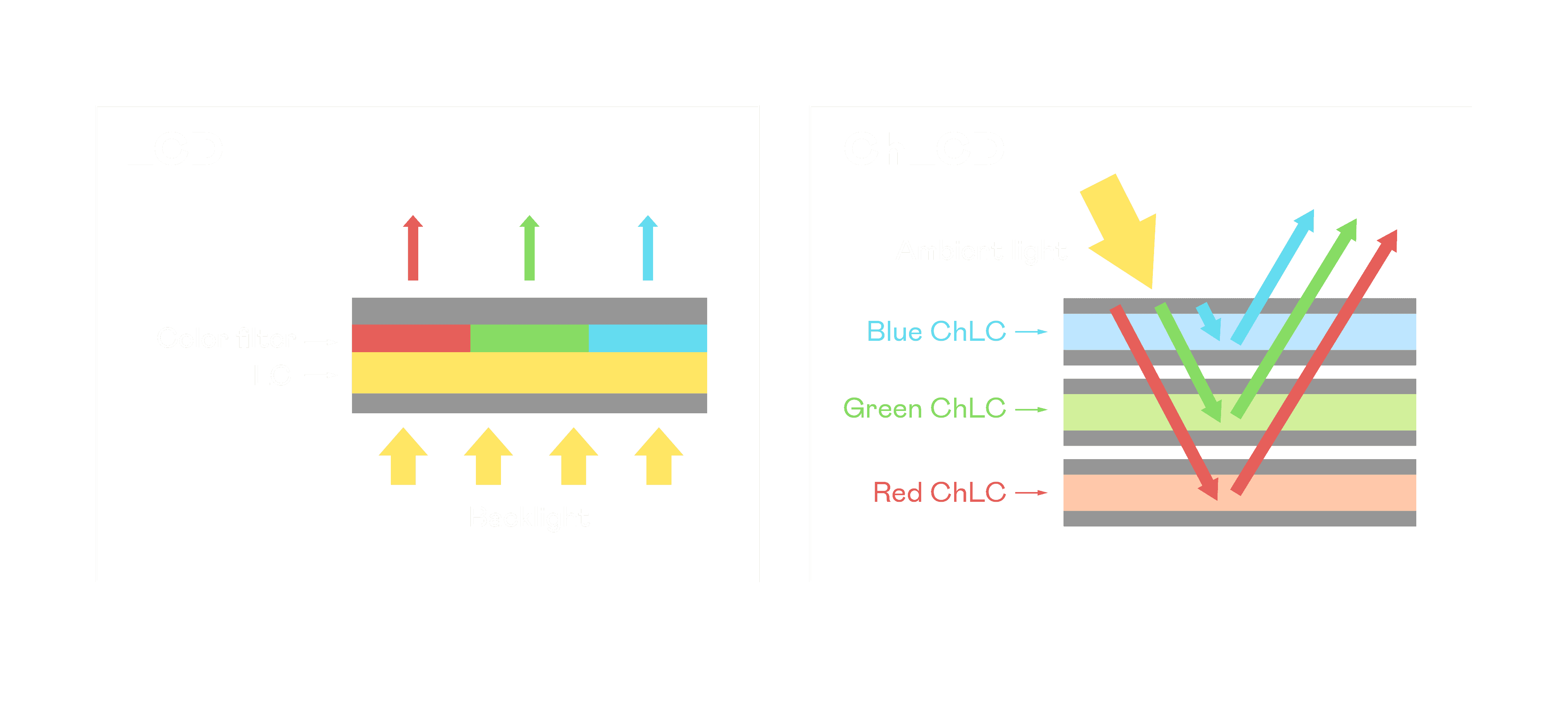 ChLCD 胆固醇液晶就如同纸张一样,,,,透过反射环境光来显示影像,,,,因此长时间观看不易造成人眼视觉疲劳,,,,可达到护眼效果。。。。当处于户外阳光下使用,,,LCD 影像容易失真而不易观看,,,,但胆固醇液晶仍可维持较佳的影像品质。。