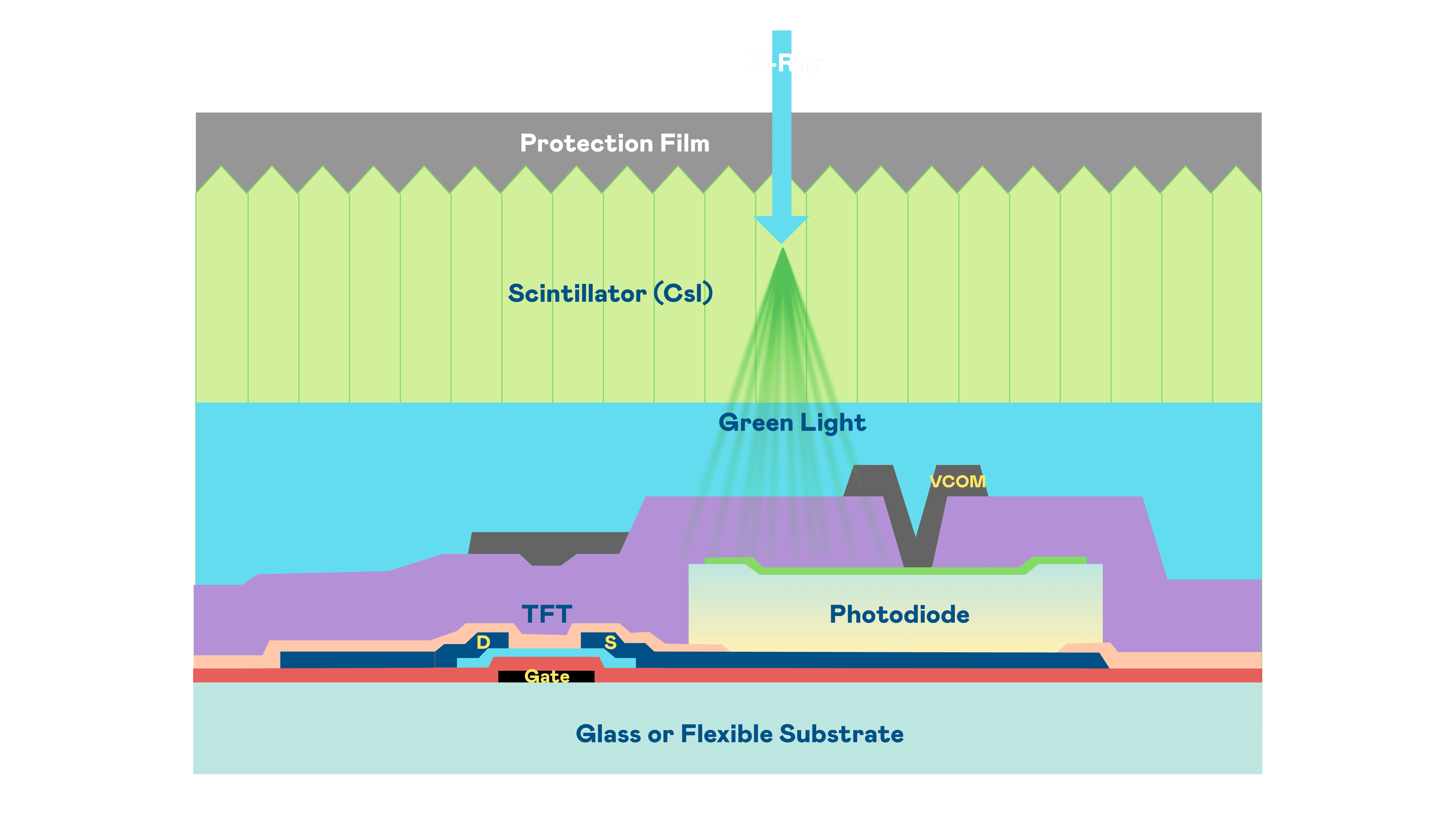 尊龙集团的X光影像感测阵列使用薄膜电晶体 (TFT) 作为每个像素的读取开关,,搭配光电二极体(Photodiode)的光电转换元件,,用以感测X光影像讯号。。。