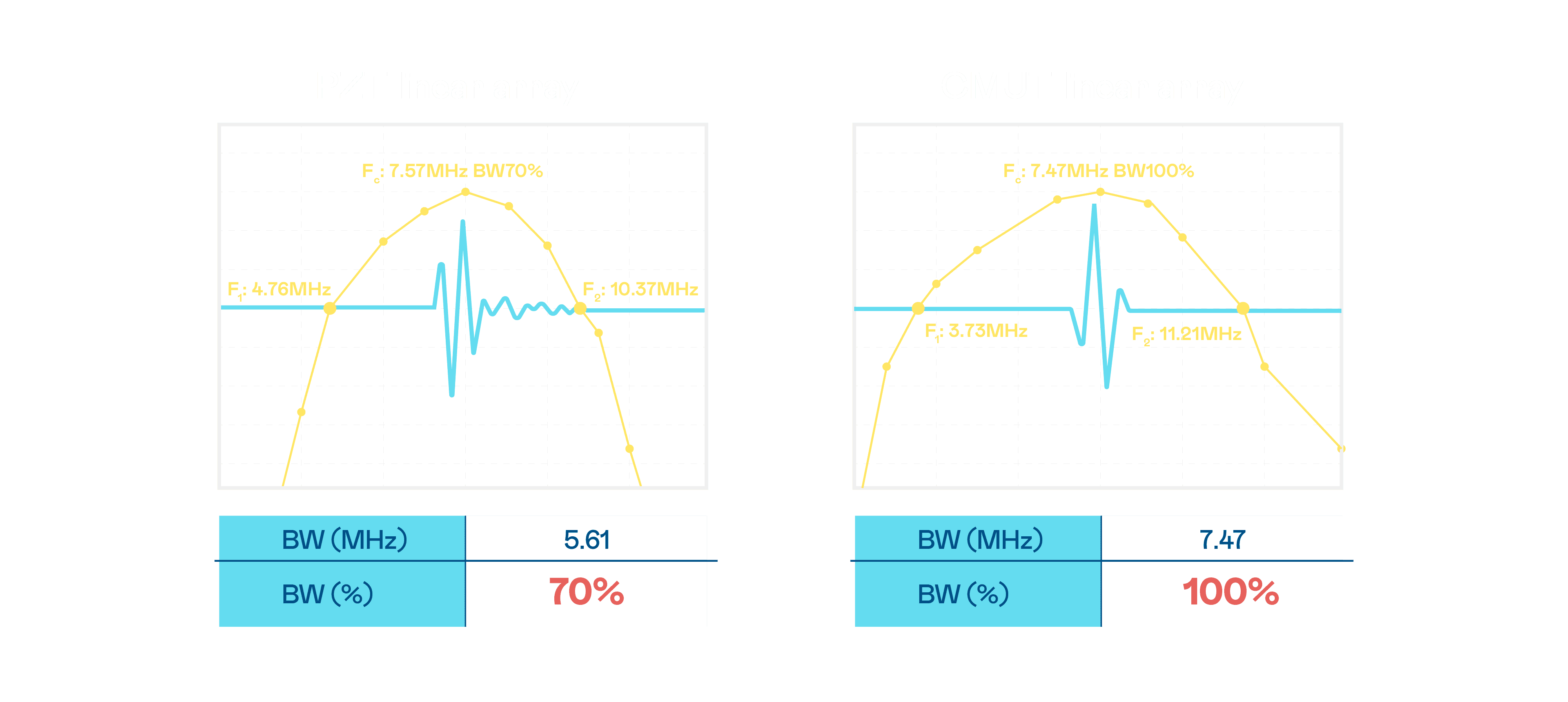 超音波影像的解析度高低,,首先取决于探头能发出的讯号频宽。。尊龙集团 CMUT 可提供高清晰的超音波讯号,,,,提供高频宽、、高灵敏度、、影像纹理细节更高的超音波影像,,,,协助医护人员缩短影像判读时间及利用精准的医疗影像进行诊断。。。。